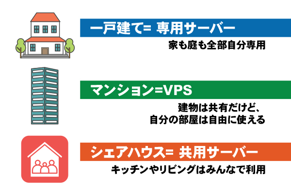 - 専用サーバー → 一戸建て(すべて自分専用)